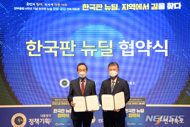 [전주=뉴시스]김얼 기자 = 정부출범 4주년 기념 한국판 뉴딜 경청·공감 전북 대토론 '한국판 뉴딜, 지역에서 길을 찾다'가 열린 20일 전북 전주시 전북도청 대강당에서 송하진 전북도지사와 조대엽 정책기획위원회 위원장이 협약식을 마치고 기념촬영을 하고 있다. 2021.05.20. [email protected]