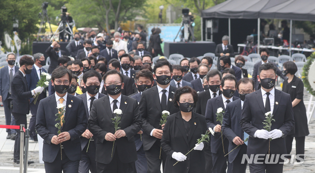 [김해=뉴시스]차용현 기자 = 권양숙 여사, 김부겸 국무총리, 더불어민주당 송영길 대표, 유시민 노무현재단 이사장 등 참석자들이 23일 경남 김해시 진영읍 봉하마을에서 엄수된 노무현 전 대통령 서거 12주기 추도식에서 참배하고 있다. (공동취재사진) 2021.05.23. [email protected]