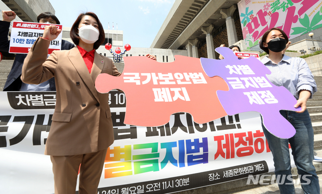 [서울=뉴시스]조성우 기자 = 김재연 진보당 상임대표(왼쪽)와 홍희진 진보당 인권위원장이 24일 오전 서울 종로구 세종문화회관 앞에서 열린 차별금지법 제정 10만 국민동의청원 돌입 기자회견에서 '국가보안법 폐지', '차별금지법 제정' 두 개의 퍼즐 모양을 합치는 퍼포먼스를 하고 있다. 2021.05.24. [email protected]