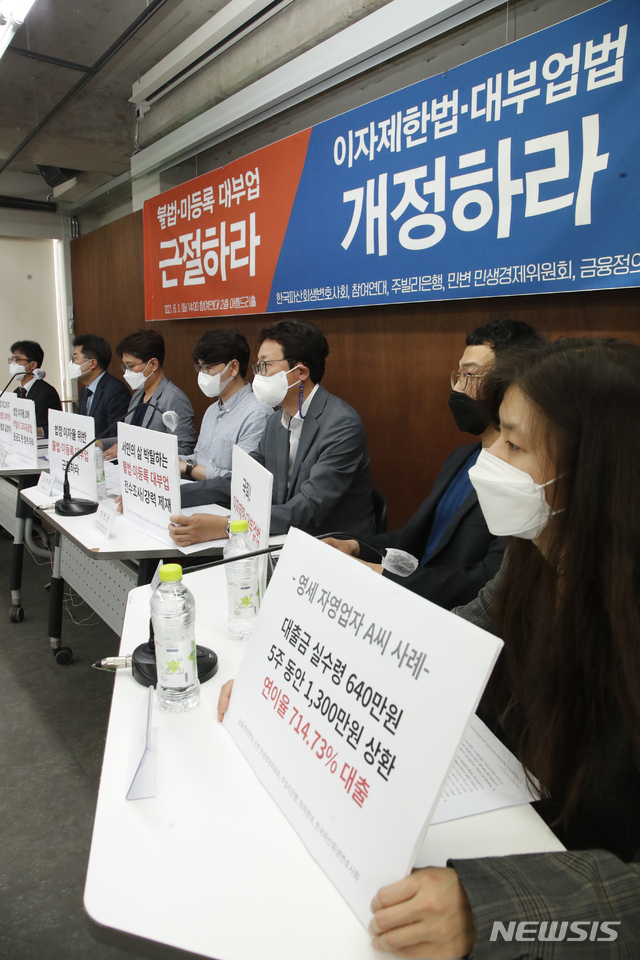 [서울=뉴시스]김형수 기자 = 참여연대,금융정의연대 등 단체 회원들이 1일 오후 서울 종로구 참여연대 사무실에서 ‘불법·미등록 대부업 근절,이자제한법·대부업법 개정 촉구’기자회견을 갖고 있다.왼쪽부터 백주선 한국파산회생변호사회장,장동훈 한국파산회생변호사회 이사,이창용·김예원 주빌리은행 간사,박현근 변호사,권호현 참여연대 경제금융센터 실행위원,전지예 금융정의연대 사무국장. 2021.06.01. [email protected]