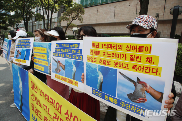 [서울=뉴시스]김형수 기자 = 한국동물보호연합,동물의목소리 회원들이 2일 오후 서울 중구 롯데호텔서울 앞에서 ‘샥스핀(Shark’s Fin) 판매 중단‘을 촉구하는 기자회견을 하고 있다. 2021.06.02. [email protected]