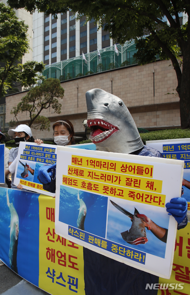 [서울=뉴시스]김형수 기자 = 한국동물보호연합,동물의목소리 회원들이 2일 오후 서울 중구 롯데호텔서울 앞에서 ‘샥스핀(Shark’s Fin) 판매 중단‘을 촉구하는 퍼포먼스를 하고 있다. 2021.06.02. [email protected]