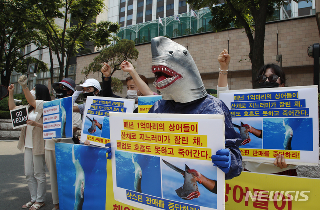 [서울=뉴시스]김형수 기자 = 한국동물보호연합,동물의목소리 회원들이 2일 오후 서울 중구 롯데호텔서울 앞에서 ‘샥스핀(Shark’s Fin) 판매 중단‘을 촉구하는 퍼포먼스를 하고 있다. 2021.06.02. [email protected]
