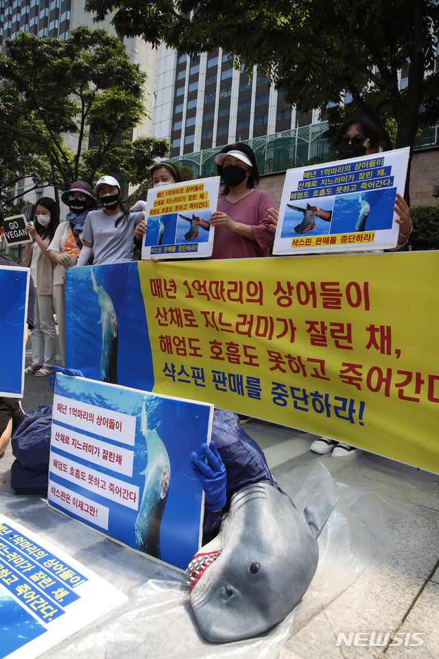 [서울=뉴시스]김형수 기자 = 한국동물보호연합,동물의목소리 회원들이 2일 오후 서울 중구 롯데호텔서울 앞에서 ‘샥스핀(Shark’s Fin) 판매 중단‘을 촉구하는 퍼포먼스를 하고 있다. 2021.06.02. [email protected]
