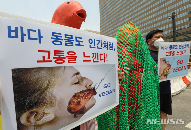 [서울=뉴시스]박주성 기자 = 한국채식연합과 비건세상을위한시민모임이 8일 오후 서울 광화문 이순신동상 앞에서 '세계 바다의 날'을 맞아, 바다 파괴를 중단하고 비건(Vegan) 채식을 촉구하는 퍼포먼스를 하고 있다. 2021.06.08. [email protected]