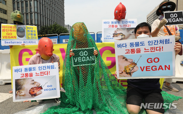 [서울=뉴시스]박주성 기자 = 한국채식연합과 비건세상을위한시민모임이 8일 오후 서울 광화문 이순신동상 앞에서 '세계 바다의 날'을 맞아, 바다 파괴를 중단하고 비건(Vegan) 채식을 촉구하는 퍼포먼스를 하고 있다. 2021.06.08. [email protected]