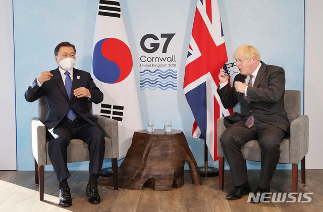[콘월(영국)=뉴시스]박영태 기자 = G7 정상회의 참석차 영국을 방문 중인 문재인 대통령이 13일(현지시간) 영국 콘월 카비스베이 양자회담장에서 보리스 존슨 영국 총리와 한-영 정상회담을 하기 위해 마스크를 벗고 있다. 2021.06.13. [email protected]