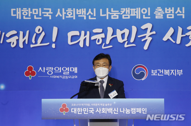 [서울=뉴시스]김형수 기자 = 대한민국 사회백신 나눔캠페인 출범식이 15일 오후 서울 중구 사랑의열매 회관에서 열려 권덕철 보건복지부 장관이 축사를 하고 있다.이 행사는 코로나19의 장기화 및 경기침체로 어려움을 겪는 재난 취약계층과 코로나 블루 등 새로운 사회문제를 지원하기 위해 마련됐으며 캠페인의 목표액은 350억원, 기간은 7월 31일까지이다. 2021.06.15. [email protected]