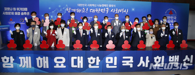 [서울=뉴시스]김형수 기자 = 대한민국 사회백신 나눔캠페인 출범식이 15일 오후 서울 중구 사랑의열매 회관에서 열려 참석자들이 출범식 퍼포먼스를 하고 있다. 앞줄 왼쪽부터 양옥경·이태수 사랑의열매 이사,유충언 개인 1호 기부자,송주온 아너소사이어티 기부자 대표,김상균 사무총장,조흥식 사랑의열매 회장,권덕철 보건복지부 장관,윤영석 사랑의열매 서울 지회장,기업 1호 기부자 서부발전 송재섭 대표,이연배·문형구 사랑의열매 이사,신정찬 복지대표. 이 행사는 코로나19의 장기화 및 경기침체로 어려움을 겪는 재난 취약계층과 코로나 블루 등 새로운 사회문제를 지원하기 위해 마련됐으며 캠페인의 목표액은 350억원, 기간은 7월 31일까지이다. 2021.06.15. [email protected]