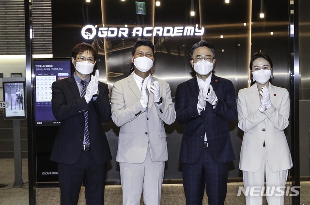 [서울=뉴시스]스크린골프 전문기업인 골프존이 골프 레슨 'GDR 아카데미' 직영 100호점을 30일 서울 역삼동 스타필드에 문을 열었다. GDR아카데미 100호점인 ‘강남센터필드점’ 오픈식에 참석한 골프존 사업기획팀 안웅기 상무, 골프존 박강수 대표이사, 신세계프라퍼티 임영록 대표이사, 더 샵스 앳 센터필드 박혜윤 점장(왼쪽부터)이 테이프컷팅 후 축하의 박수를 치고 있다. 100호점인 ‘강남센터필드점’은 강남권 최대인 약 1,090㎡(330평) 규모로서 높은 접근성과 다양한 즐길 거리를 갖추고 있다. 골프존의 스크린골프 연습 시뮬레이터인 'GDR PLUS'가 30대, VIP 개인룸 5개를 보유하고 있으며, 체계적인 커리큘럼을 기반으로 한 맞춤 레슨도 가능하다. 2021.06.30. [email protected]