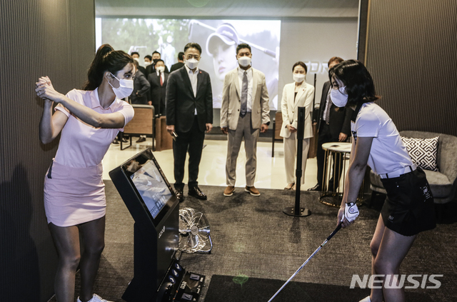 [서울=뉴시스]스크린골프 전문기업인 골프존이 골프 레슨 'GDR 아카데미' 직영 100호점을 30일 서울 역삼동 스타필드에 문을 연 가운데 100호점인 ‘강남센터필드점’을 찾은 고객이 레슨프로로부터 스윙을 교정 받고 있다. 이곳에서는 유명 레슨 프로가 체계적인 커리큘럼을 기반으로 개인별 맞춤 레슨을 제공한다. 개인룸 보유 매장으로 프라이빗하게 골프 연습을 하려는 고객들에게 최적화된 매장으로 고급 인테리어 및 휴게시설을 구축했다. 2021.06.30. [email protected]