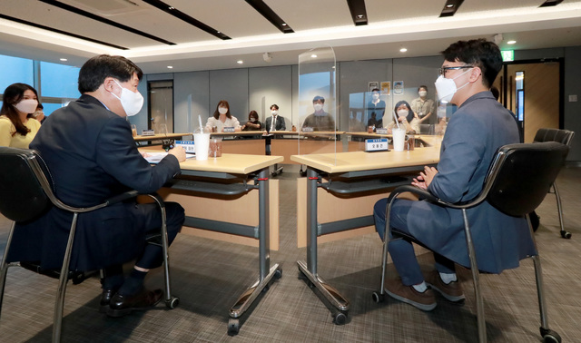 [서울=뉴시스]이영환 기자 = 안경덕 고용노동부 장관이 9일 오후 부산광역시 청년센터를 방문해 청년들과 간담회를 하고 있다. (사진=고용노동부 제공) 2021.07.09. [email protected] *재판매 및 DB 금지