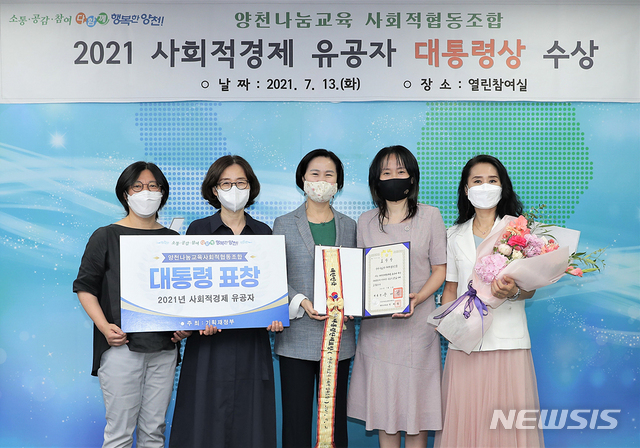 [서울=뉴시스] 김수영 양천구청장이 13일 서울 양천구청 열린참여실에서 열린 2021년 사회적경제 대통령 표창 수상 간담회에 참석해 수상자인 양천나눔교육 사회적협동조합과 기념촬영을 하고 있다. (사진=양천구 제공) 2021.07.13. [email protected]