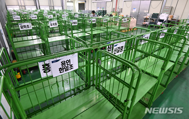 [용인=뉴시스] 김종택기자 = 코로나19 확산으로 수도권 사회적 거리두기 4단계가 시행되면서 초·중·고등학교가 원격수업으로 전환, 학교급식이 중단된 14일 오후 경기도 용인시 농협학교급식지원센터에 농산물 운반용 카트가 텅 비어 있다. 2021.07.14.