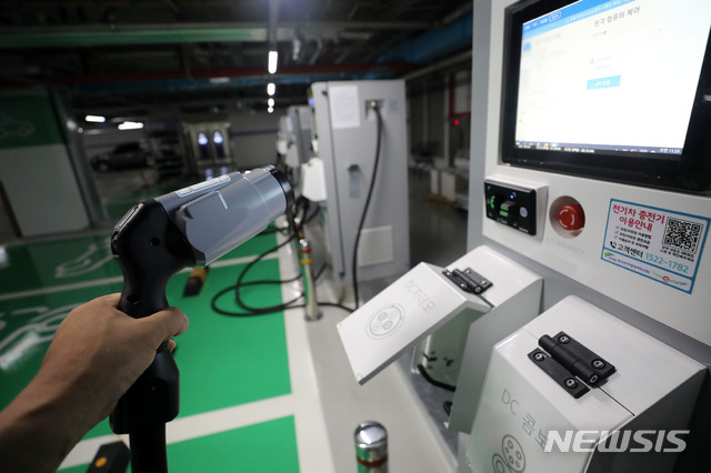 [서울=뉴시스] 고범준 기자 = 정부가 BIG3(반도체·미래차·바이오헬스) 추진회의에서 다가오는 2025년까지 전기차 급속충전기는 고속도로 휴게소 등 중심으로 1만2000개 이상, 완속 충전기는 도보 5분 거리 생활권에 50만기 이상, 상용차 충전소는 버스·택시 차고지 중심으로 2,300개 이상 구축되도록 추진하겠다고 밝혔다. 사진은 29일 오후 서울 강남구 코엑스 주차장에 전기자동차 충전기가 설치되어 있는 모습. 2021.07.29. [email protected]