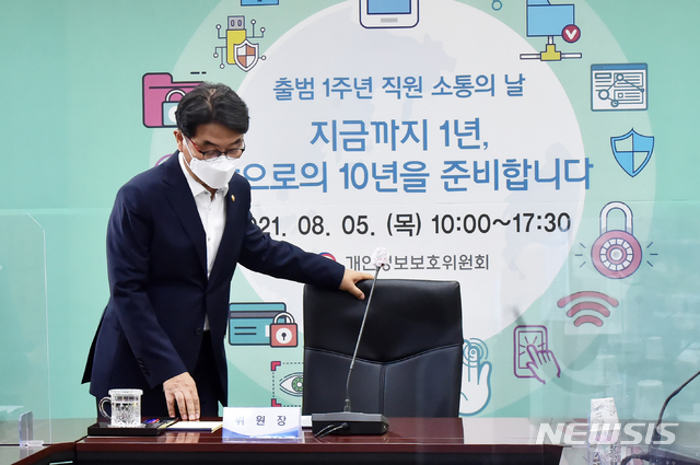 [서울=뉴시스] 김명원 기자 = 윤종인 개인정보보호위원회 위원장이 5일 서울 종로구 세종대로 정부서울청사에서 개인정보보호위원회 출범 1주년 직원소통행사에 참석하고 있다. (공동취재사진) 2021.08.05. [email protected]
