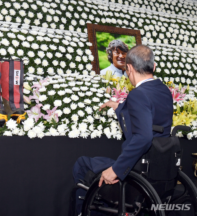 [광주=뉴시스] 류형근 기자 = 정진완 대한장애인체육회장이 5일 오후 광주 서구 염주종합체육관에 설치된 장애 산악인 김홍빈 대장 분향소를 찾아 조문하고 있다. 2021.08.05. [email protected]