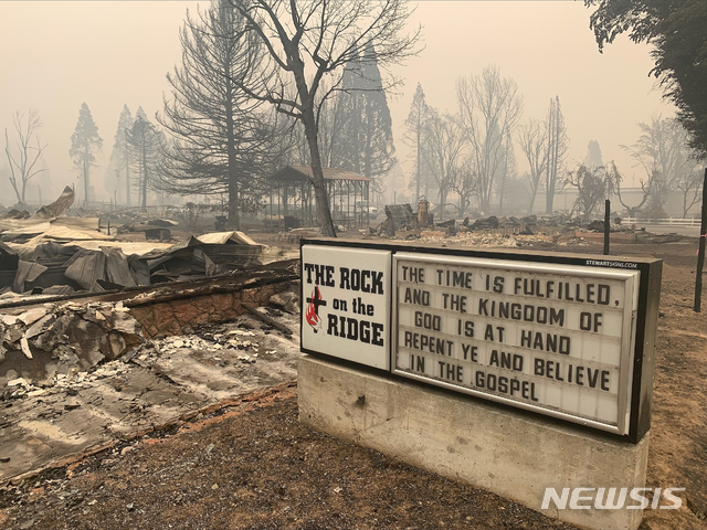 [그린빌=AP/뉴시스] 미 캘리포니아주에서 발생한 최악의 '딕시 산불'로 12일(현지시간) 그린빌에 있는 한 교회에 안내 표지석만 남아 있다. '딕시 산불'은 캘리포니아 역사상 가장 큰 단일 화재이며 현재 미국에서 진행 중인 가장 큰 규모의 화재로 7개 카운티에 걸쳐 한 달가량 이어지며 서울 면적의 3배가 넘는 규모의 피해를 초래했다. 2021.08.13.