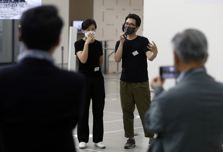[서울=뉴시스] 고승민 기자 = 2일 서울 국립현대미술관에서 열린 'MMCA 현대차 시리즈 2021 : 문경원&전준호-미지에서 온 소식, 자유의 마을' 간담회에서 전준호 작가가 전시에 대해 설명하고 있다.