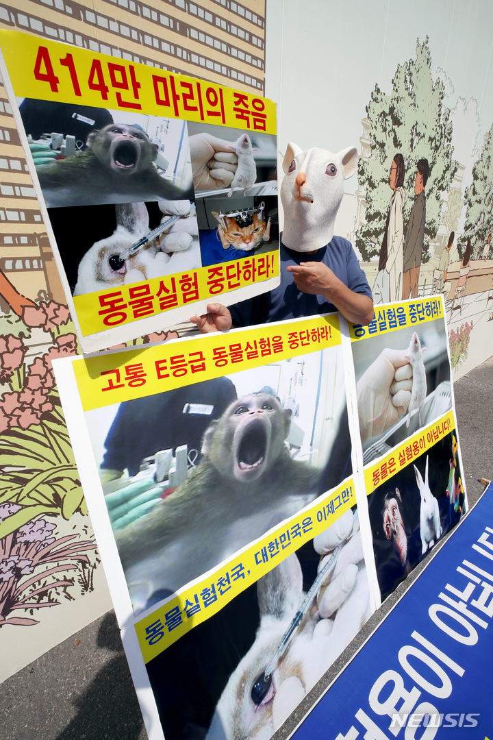 [서울=뉴시스] 김병문 기자 = 이원복 한국동물보호연합 대표가 13일 오후 서울 종로구 광화문 이순신장군 동상 앞에서 열린 '414만 마리의 죽음, 동물실험 중단 촉구 기자회견'에서 퍼포먼스를 하고 있다. 2021.09.13. [email protected]