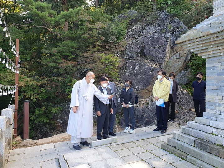 [서울=뉴시스] 김현모 문화재청장이 16일 강원도 정선 정암사를 방문해 주지스님으로부터 사찰 현황에 대해 설명을 듣고 있다. (사진=문화재청 제공) 2021.09.16. [email protected] *재판매 및 DB 금지