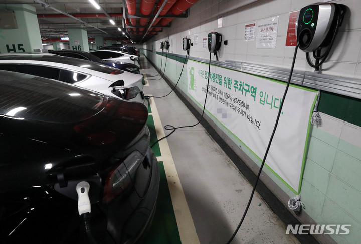[서울=뉴시스] 백동현 기자 = 전기차 보급이 늘어나면서 결함으로 인한 리콜 대수가 급격히 증가하고 있는 27일 오후 서울 시내 한 상가 주차장에 전기차가 충전 주차 되어 있다. 지난해 국토교통부 자동차리콜센터에 집계된 전기차(수소전기차 포함) 리콜 대수는 9만 746대(2016년 대비 173배, 2019년 대비 7배)에 이른다. 2021.09.27. [email protected]