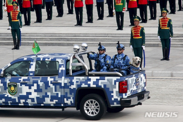 [아슈하바트=AP/뉴시스] 27일(현지시간) 투르크메니스탄 수도 아슈하바트에서 독립 제30주년 기념 군사 퍼레이드가 열려 경찰관들이 수색견과 차량에 올라 행진하고 있다. 투르크메니스탄은 1991년 10월 27일 구 소련으로부터 독립했으며 이날 퍼레이드에는 군대와 군 장비 이외에도 정부 부처와 기관 직원들도 등장했다. 2021.09.28.