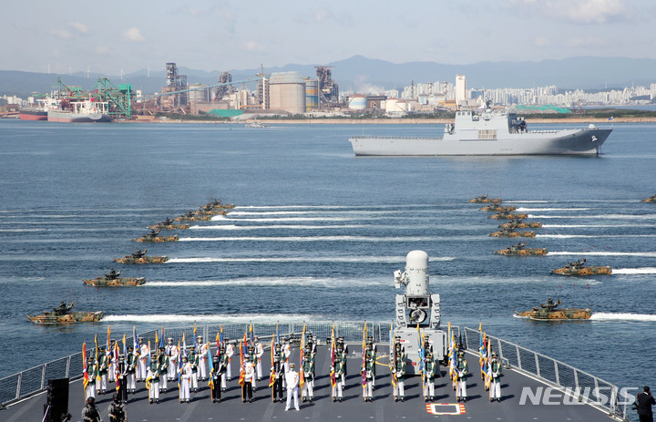 [포항=뉴시스] 김진아 기자 = 문재인 대통령이 참석한 가운데 1일 경북 포항 영일만 해상에서 열린 제73주년 국군의 날 기념식에서 합동상륙작전 시연이 펼쳐지고 있다. 2021.10.01. [email protected]