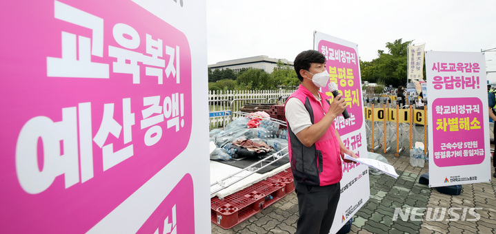 [서울=뉴시스] 김병문 기자 = 이종남 민주노총 서비스연맹 전국학교비정규직노동조합 조직실장이 7일 오전 서울 여의도 국회 앞에서 '학교비정규직 불평등, 교육복지 외면하는 교육감 규탄 기자회견'을 하고 있다. 2021.10.07. [email protected]