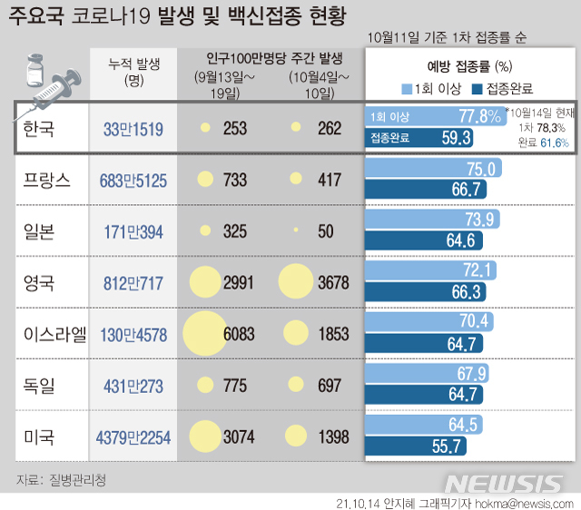 [서울=뉴시스] 세계보건기구(WHO)에 따르면 지난 11일 기준 미국의 접종 완료율은 55.7%, 이스라엘은 64.7%다. 이밖에 ▲영국 66.3% ▲프랑스 66.7% ▲독일 64.7% ▲일본 64.6%의 접종 완료율을 기록하고 있다. (그래픽=안지혜 기자)