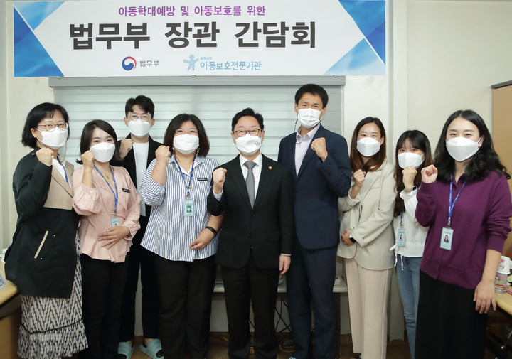 [서울=뉴시스] 고범준 기자 = 박범계 법무부장관이 15일 충북남부아동보호전문기관을 방문해 관계자들과 간담회를 마치고 기념촬영을 하고 있다. (사진=법무부 제공) 2021.10.15. [email protected] *재판매 및 DB 금지