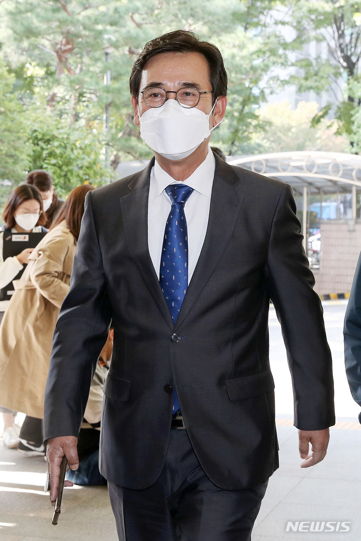 [서울=뉴시스] 김병문 기자 = '검찰이 노무현재단의 계좌를 들여다 봤다' 등 발언으로 한동훈 검사장의 명예를 훼손한 혐의를 받는 유시민 노무현재단 이사장이 21일 오후 서울 마포구 서울서부지방법원에서 열린 라디오에 의한 명예훼손 혐의 1차 공판기일에 출석하고 있다. 2021.10.21. [email protected]
