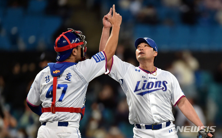 [대구=뉴시스] 이무열 기자 = 22일 오후 대구 수성구 삼성라이온즈파크에서 열린 ‘2021 신한은행 SOL KBO리그’ 삼성 라이온즈와 KT 위즈의 경기, 4대2로 승리한 삼성 마무리 투수 오승환과 포수 강민호가 기뻐하고 있다. 2021.10.22. [email protected]