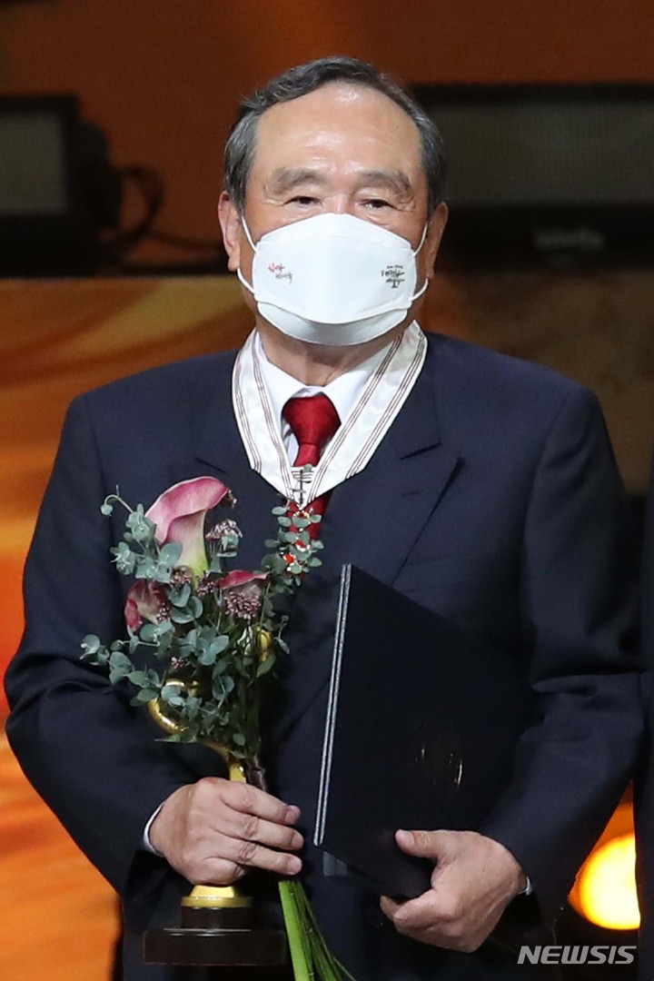 [서울=뉴시스] 박진희 기자 = 연기자 박인환이 28일 서울 중구 국립극장에서 열린 ‘2021 대한민국 대중문화예술상’ 시상식에 참석하여 보관문화훈장을 수상하고 있다. 2021.10.28. [email protected]