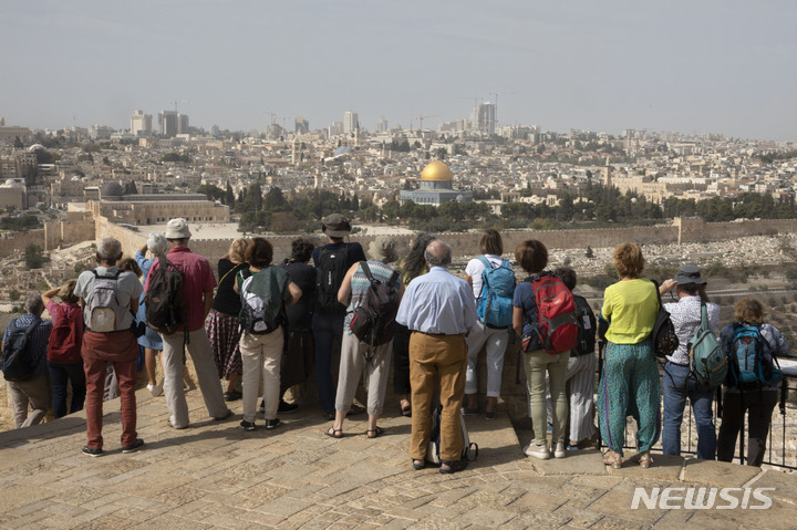 [예루살렘=AP/뉴시스] 1일(현지시간) 이스라엘 예루살렘의 올리브 산에서 프랑스 관광객들이 알아크사 사원을 바라보고 있다. 이스라엘은 이날부터 코로나19 백신 2차 접종 완료 외국인 관광객을 대상으로 입국을 허용한다고 밝혔다. 2021.11.01.
