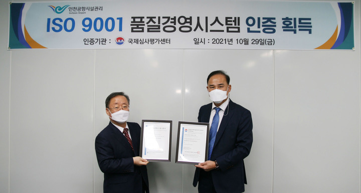 [인천공항=뉴시스] 홍찬선 기자 = 지난달 29일 인천 중구 인천공항시설관리 대회의실에서 열린 ISO 9001 인증서 수여식에서 안일형(오른쪽)인천공항시설관리 사업본부장이 정을섭 국제심사평가센터 원장에게 인증서를 받고 있다. ISO 9001 품질경영시스템은 국제표준화기구(ISO)가 제정한 표준 규격으로 제품 또는 서비스의 실현 체계가 국제 표준 요구사항을 만족하고 이를 지속적으로 유지·관리함을 객관적으로 인증하는 제도다. (사진=인천공항시설관리 제공) 2021.11.01. [email protected]