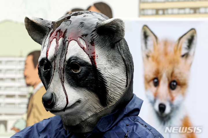 [서울=뉴시스] 김병문 기자 = 한국동물보호연합 회원들이 9일 오후 서울 종로구 광화문네거리에서 열린 모피(FUR) 퇴출 촉구 기자회견에서 퍼포먼스를 하고 있다. 2021.11.09. [email protected]