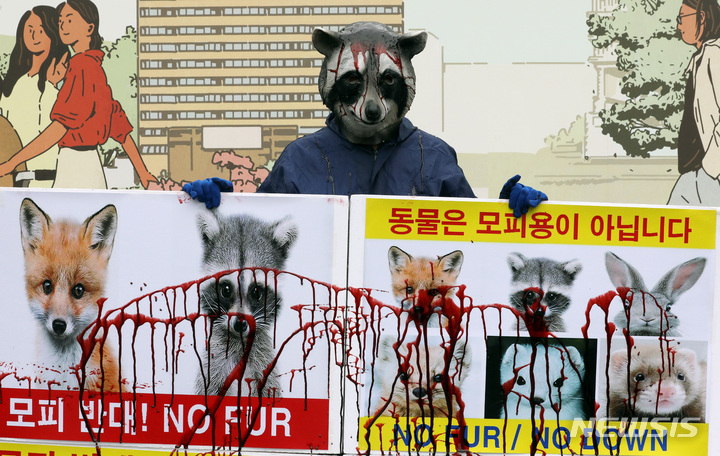 [서울=뉴시스] 김병문 기자 = 한국동물보호연합 회원들이 9일 오후 서울 종로구 광화문네거리에서 열린 모피(FUR) 퇴출 촉구 기자회견에서 퍼포먼스를 하고 있다. 2021.11.09. [email protected]