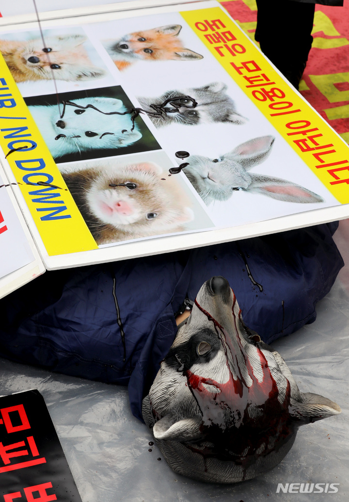 [서울=뉴시스] 김병문 기자 = 한국동물보호연합 회원들이 9일 오후 서울 종로구 광화문네거리에서 열린 모피(FUR) 퇴출 촉구 기자회견에서 퍼포먼스를 하고 있다. 2021.11.09. [email protected]