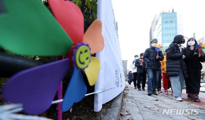 [서울=뉴시스] 홍효식 기자 = 전태일 열사 51주기를 맞아 제1회 전태일 문화거리 축제가 열린 11일 오전 서울 종로구 전태일기념관 인근 청계천 거리에서 참석자들이 노동 인권의 길을 걷고 있다. 2021.11.11. [email protected]