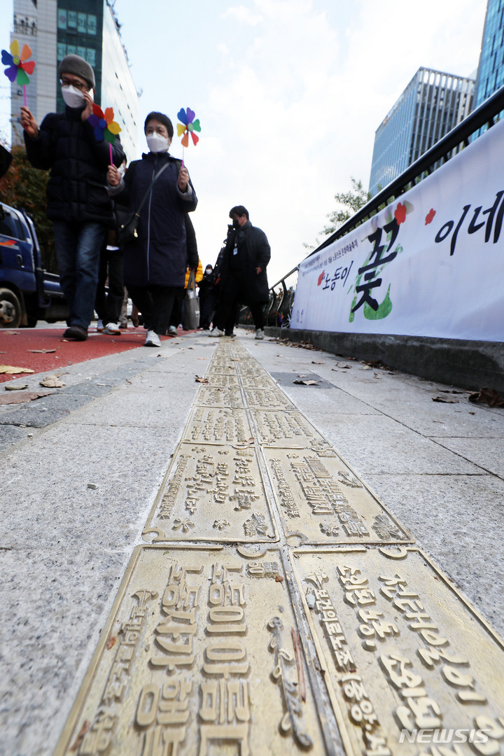 [서울=뉴시스] 홍효식 기자 = 전태일 열사 51주기를 맞아 제1회 전태일 문화거리 축제가 열린 11일 오전 서울 종로구 전태일기념관 인근 청계천 거리에서 참석자들이 노동 인권의 길을 걷고 있다. 2021.11.11. [email protected]