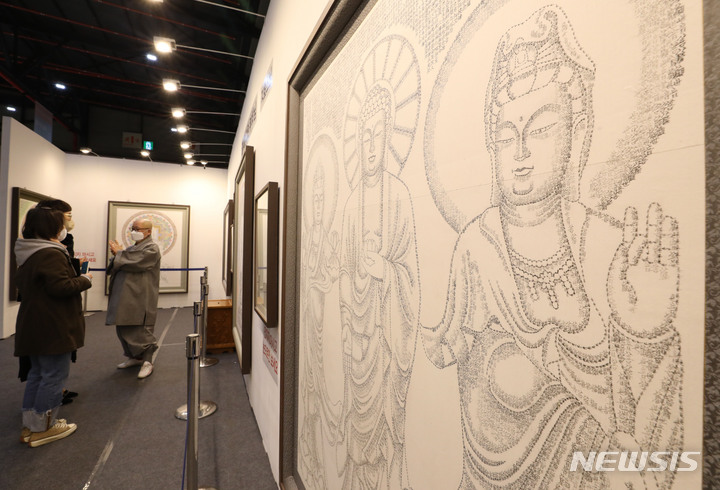 [서울=뉴시스] 박미소 기자 = 11일 오후 서울 강남구 서울무역전시컨벤션센터(SETEC)에서 열린 코로나19 속 불교식 그린라이프를 모색하는 '2021 서울국제불교박람회'에서 관람객들이 불교 미술 작품을 살펴보고 있다. 2021.11.11. [email protected]