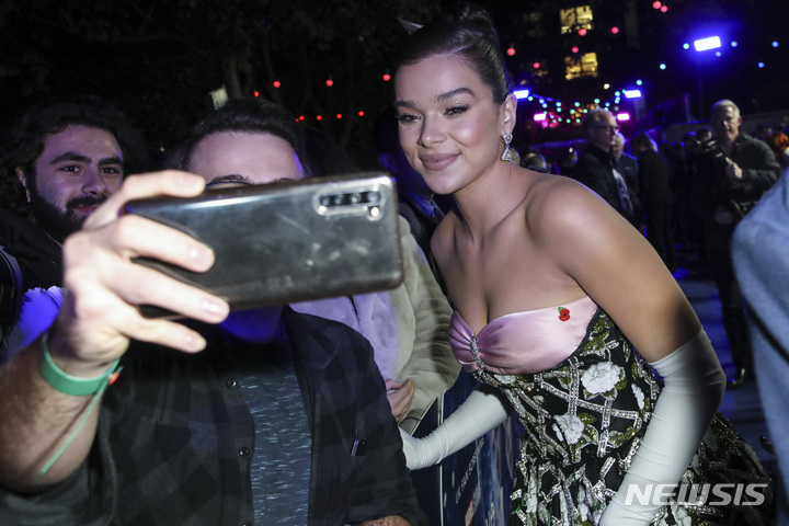 [런던=AP/뉴시스] 배우 헤일리 스테인펠드가 11일(현지시간) 영국 런던에서 열린 디즈니 플러스의 '호크아이' 영국 팬 시사회에 도착해 팬들과 사진을 찍고 있다. 2021.11.12.