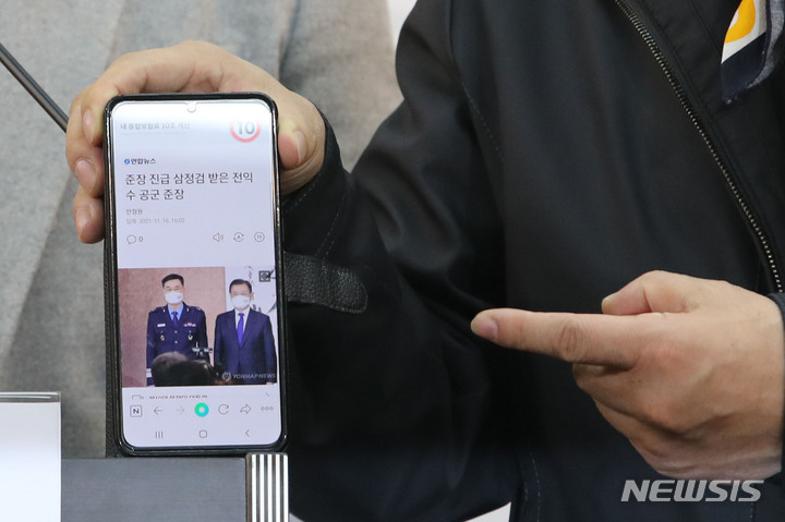 [서울=뉴시스] 권창회 기자 = 故 이 중사 부친이 17일 오전 서울 마포구 군인권센터에서 열린 '故 이 중사 성추행 사건 수사 무마 지휘 관련 제보 폭로 기자회견'에서 휴대폰을 보여주고 있다. 2021.11.17. [email protected]