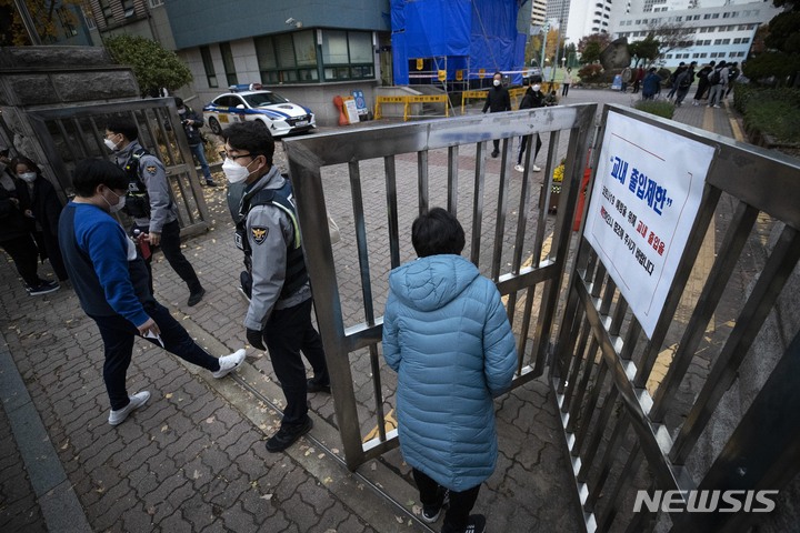 [서울=뉴시스] 사진공동취재단 = 2022학년도 대학수학능력시험이 치러진 18일 오전 서울 여의도고등학교에 마련된 시험장에서 학부모들이 자녀들을 들여보낸 뒤 뒷모습을 보고 있다. 2021.11.18. [email protected]