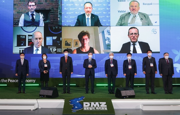 [고성(강원)뉴시스] 김경목 기자 = 26일 오전 고유환 통일연구원 원장(왼쪽부터), 진 H. 리 미국 우드로윌슨센터 한국역사·공공정책센터 선임연구원, 김흥종 대외경제정책연구원(KIEP) 원장, 이인영 통일부 장관, 정해구 경제·인문사회연구회 이사장, 최복수 강원도 행정부지사, 함명준 고성군수, 알렉산더 제빈 러시아 극동문제연구소 한국학 센터장이 강원도 고성군 소노캄 델피노 리조트 & 호텔 지하 2층 대연회장에서 열린 2021 DMZ 평화경제 국제포럼 개막식에서 기념 사진을 촬영하고 있다. (사진=대외경제정책연구원 제공) 2021.11.26. [email protected]