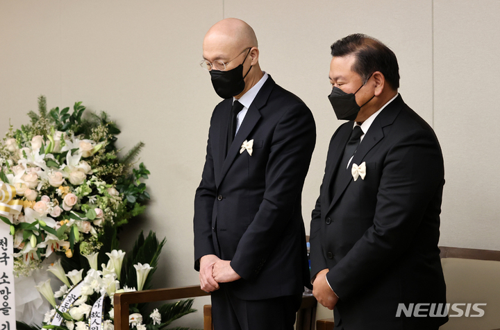 [서울=뉴시스] 김선웅 기자 = 전재용, 전재만 씨가 26일 서울 서대문구 세브란스병원 장례식장에 마련된 전직 대통령 故 전두환 씨 빈소에서 조문객을 맞이하고 있다. (공동취재사진) 2021.11.26. [email protected]