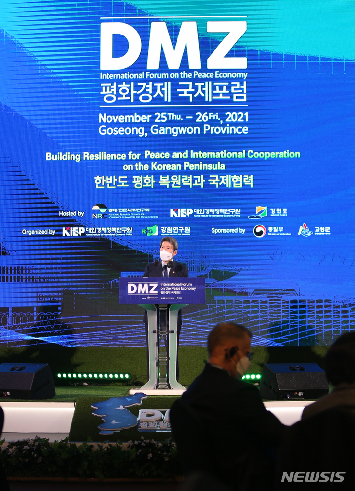 [고성(강원)=뉴시스] 김경목 기자 = 이인영 통일부 장관이 26일 오전 강원도 고성군 소노캄 델피노 리조트 & 호텔 지하 2층 대연회장에서 열린 2021 DMZ 평화경제 국제포럼 개막식에서 기조연설을 하고 있다. 2021.11.26. [email protected]