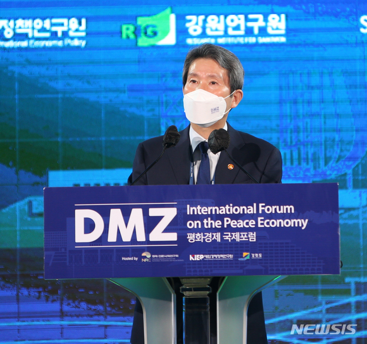 [고성(강원)=뉴시스] 김경목 기자 = 이인영 통일부 장관이 26일 오전 강원도 고성군 소노캄 델피노 리조트 & 호텔 지하 2층 대연회장에서 열린 2021 DMZ 평화경제 국제포럼 개막식에서 기조연설을 하고 있다. 2021.11.26. [email protected]