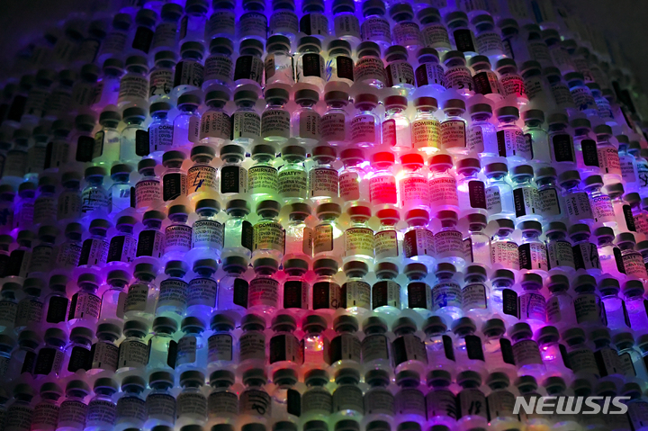 [부쿠레슈티=AP/뉴시스] 6일(현지시간) 루마니아 부쿠레슈티의 한 코로나19 백신 접종소에 빈 백신 용기로 크리스마스트리를 만들어 일부 용기 안에 들어 있는 LED 전구가 빛나고 있다. 이 접종소 직원들은 1만9000개의 빈 백신 용기로 높이 3m의 크리스마스트리를 만들었다. 이 트리를 만들기 위해 지난 3월부터 모은 이 용기는 일부에 컬러 LED가 들어가 성탄절 분위기를 더욱 자아냈다. 2021.12.07.